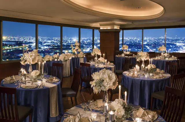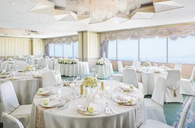 披露宴会場は全部で5会場あり、着席6名~最大630名/立食30名~最大1,200名まで対応しており、「The Terrace(ガーデンコート)」は、ホテル内にいながらガーデン感覚を楽しめる1日2組限定の会場です。また、最上階の「アクアマリン」では海まで見渡せるパノラマビューを背景にパーティーができ、ラグジュアリーな雰囲気を楽しめます。